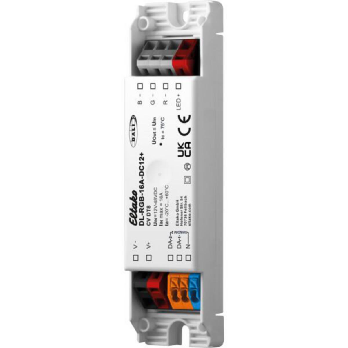 DALI-2 LED himmennin RGB-värisäädöllä. Välikatto- tai pinta-asennukseen. 120 x 30 x 22mm. Suojausluokka IP20. Valmiustilan kulutus vain 0,12 wattia.DALI-2 sertifioitu. DALI-2 on DALI-standardin uusin sukupolvi, jossa on laajempi valikoima erilaisia toimintoja. DALI-2-laitteet sisältävät myös kaikki aiemmat DALI-toiminnot ja ovat siksi yhteensopivia myös vanhempien laitteiden kanssa. Suunniteltu ohjaamaan vakiojännitteisiä LED-moduuleja (CV) käyttöjännitteillä 12V - 48V, käyttötila DT8: DALI-osoite kirkkauden ja värin säätämiseen DALI DT8, tyyppi RGBWAF.Käyttötapa Colour&Dim: aktivoidaan 2 DALI-osoitteella, yksi kirkkauden säätämiseksi ja toinen värin asettamiseksi.SwitchDim2: Toiminta kahden kytkintulon kautta mahdollistaa kirkkauden ja värin hallinnan ilman DALI-toimintoa.Himmennysalue 0,1% - 100%. Vaihdettava PWM-taajuus (122Hz / 244Hz / 488Hz / 976Hz). Käyttöjännite 12V - 48V DC (LED-moduulien käyttöjännitteestä riippuen). Liitäntävirta 16A. Suurin liitetty virta voidaan jakaa mille tahansa kanavalle. Pieni valmiustilan kulutus. Korkea hyötysuhde. Konfigurointi DALI Cockpit PC -ohjelmiston ja DALI USB -liitännän kautta.