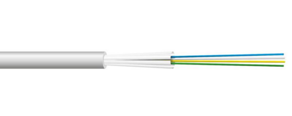 Sisä/ulko valokaapeli- G.657.A1 mukaiset yksimuotokuidut- Kiinteä 0,9 mm kuitupäällyste-Lasikuitulujitteet vaipan alla-Vaippa halogeentitonta palonestomateriaalia-Vaipan väri vaalean harmaa