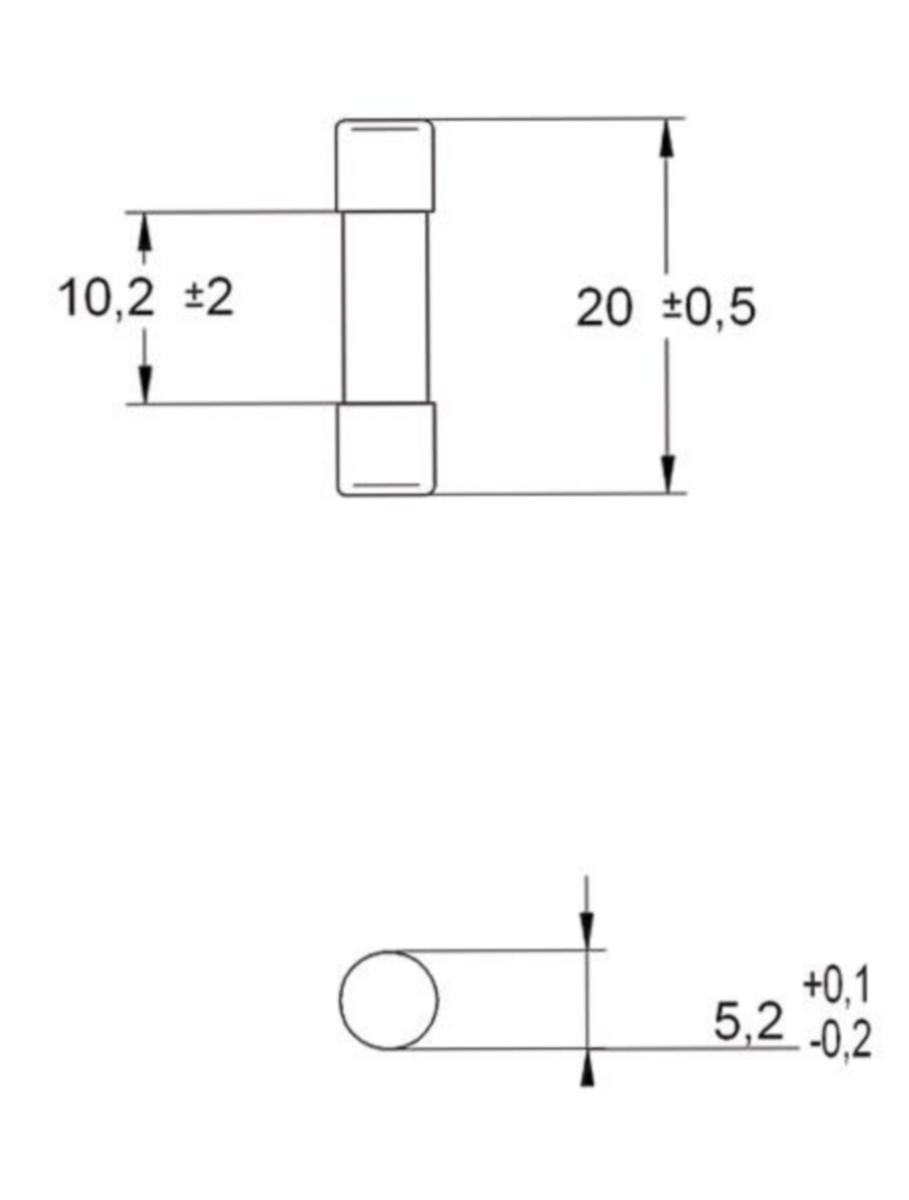 Lasiputkisulake, Mitat: 5 x 20 mm, hidas (T), nimellisjännite 250 VAC, standardien IEC 60127-1 ja IEC 60127-2 mukainen.