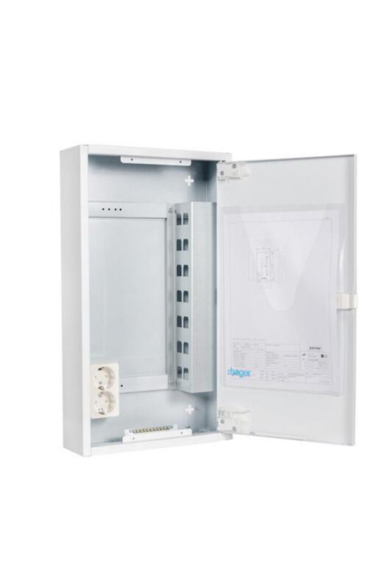 Data-asennuskotelo IP30 (saneeraukseen). Pinta-asennukseen, ovella. Kotelo kuumasinkittyä teräslevyä. 2-osainen pistorasia sekä tilat aktiivilaitteille. Takalevyssä on puhkaistava aukko 120x210 mm. Paikat RJ45-liittimille 14 kpl, liitinaihiot Actassi, Keystone ja Amp- RJ45 -liittimille. Oven kätisyys on vaihdettavissa. Voidaan asentaa pystyyn, vaakaan tai yhteen ryhmäkeskuksen (3332372) kanssa, soveltuu asennettavaksi esim. oven yläpuolelle vaakaan.