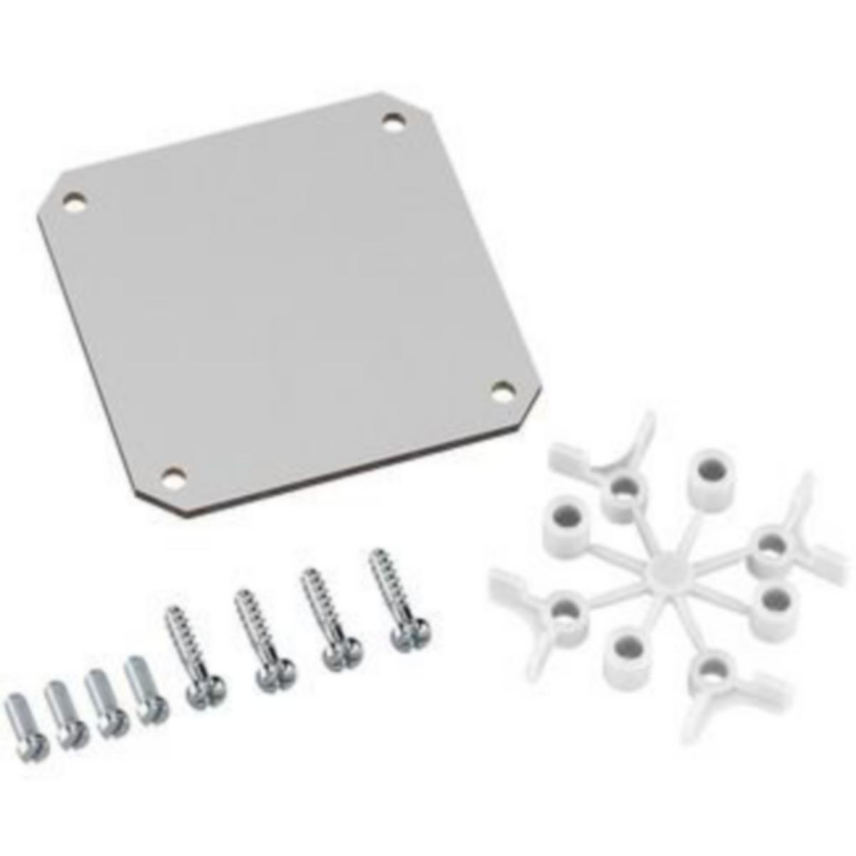 Asennuslevy eristävästä materiaalista, sisältää kiinnitysruuvit ja korotuspalat.