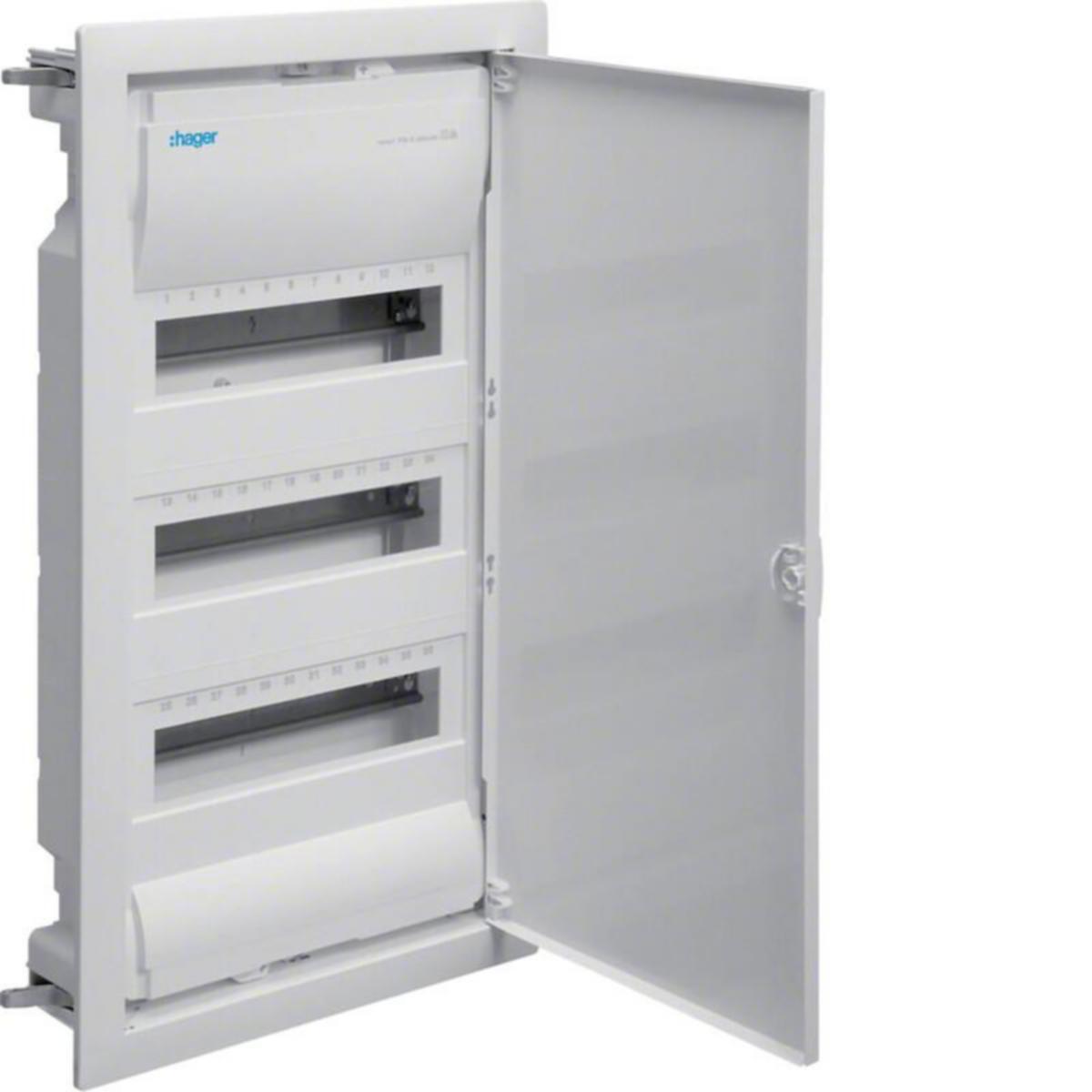 Moduulikotelo 36 moduulia DIN-mitoitetuille moduulikomponenteille, metallisella ovikehyksellä ja muovisella upotuskaukalolla. Uppoasennus kevyisiin väliseiniin. Minimiupotussyvyys 88 mm asennettaessa ilman erikseen tilattavaa korotuskehystä. Kiinnitys levyseinään mukana toimitettavilla pysty- ja vaakasuuntaisen kiinnityksen mahdollistavilla kiinnitysankkureilla.