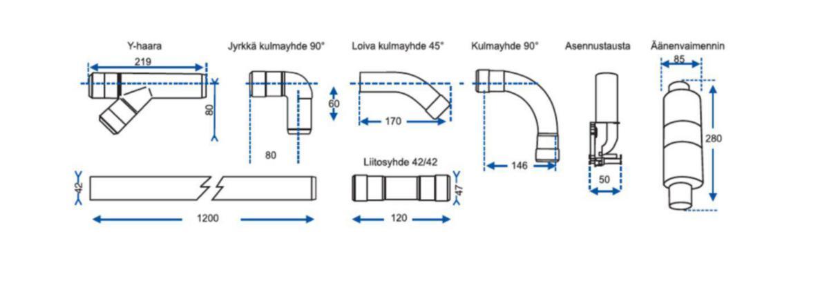 Imurasia 1 kpl, putki 1,2 m 5 kpl, mutka 90° loiva 1 kpl, Y-haara 1 kpl, mutka 45° 3 kpl, mutka 90° 2 kpl, liitosyhde 42/42 5 kpl, putkikiinnike 10 kpl, sähköjohto 10 m, tiivisterengas 20 kpl, asennusohje 1 kpl