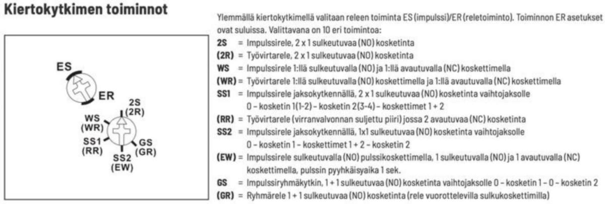 Ylemmällä kiertokytkimellä valitaan releen toiminta ES (impulssirele)/ER (työvirtarele).