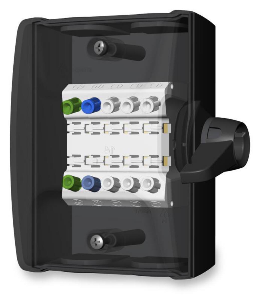Kotelon ylä- ja alaosassa on kaksi M25 läpivientiä. Mustat holkkitiivisteet 2xM25 sisältyvät toimitukseen. Kotelon ja vivun väri musta.