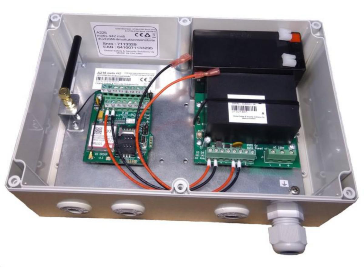 Laite sisältää metis 442 - 4G/GSM ilmoituksensiirtolaitteen sekä B265 akkulaturi / virtalähteen sekä 12V, 1,2Ah lyijyhyytelöakun.Jännitesyöttö 230VAC. Tällä turvataan metiksen toiminta myös sähkökatkojen aikana. Laite voi lähettää tekstiviestillä tiedon sähkökatkosta ja sähköjen paluusta.