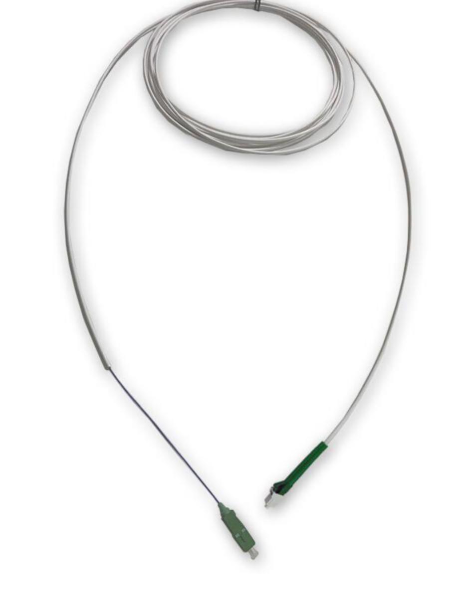 3mm paksu sisäulkokytkentäkaapeli, jonka toisessa päässä on SC/APC liitin ja toisessa LC/APC liitin. Kaapelin väri valkoinen. Pituus 1m. SC/APC-päästä on kuorittu 10cm esille 900um kuitua.