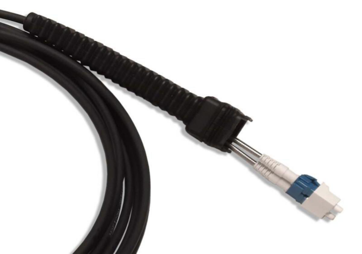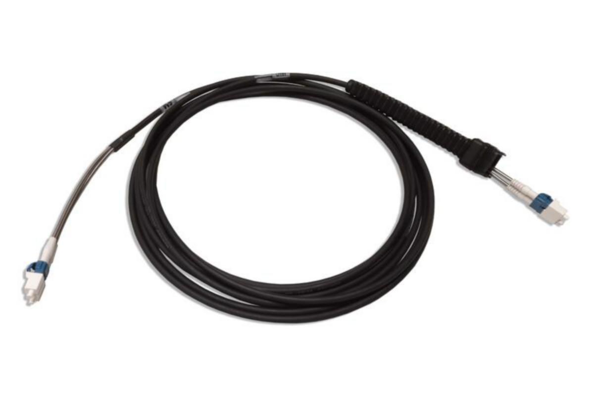 Mastojumpperi, toisessa päässä LC duplex-liitin sekä suojakumi ja toisessa päässä LC duplex-liitin. Kaapelin kuorittu osa suojattu armeerauksella. Pituus 3m. Yksimuoto