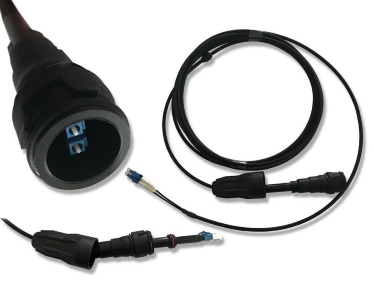 Mastojumpperi, molemmissa päissä LC/UPC liittimet. Toisessa päässä IP67-luokituksen suoja liittimelle. IP67-liitin on yhteensopiva FullAXS liittimen kanssa.