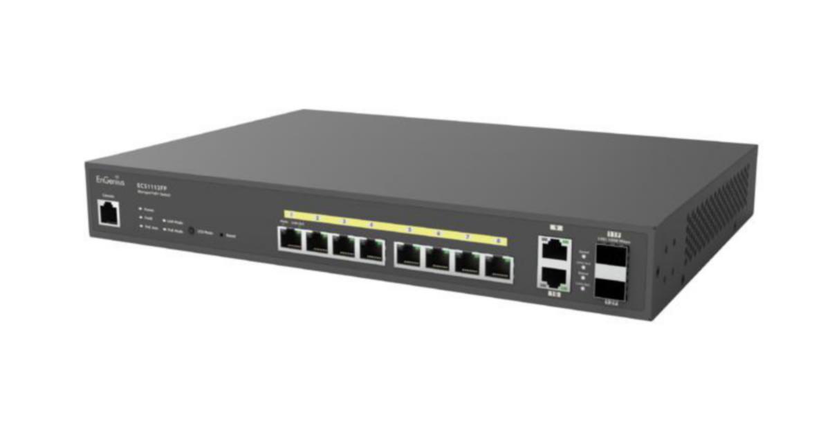 EnGenius Cloud ECS1112FP on 8-porttinen Gigabit PoE+ Layer 2+ kytkin 130W PoE-teholla. Lisäksi siitä löytyy 2x 2 GbE ja 2 Dual-Speed SFP-portit.ECS1112FP kuuluu EnGeniuksen uuden sukupolven Cloud-laitesarjaan. Hallinta paikallisesti tai pilven kautta etänä asentajaa helpottaen. Laitteen asetukset ovat yksinkertaisesti ohjelmoitavissa ja käyttöönotto erittäin helppoa. Ominaisuudet 8 10/100/1000 Base-T GbE Ports
