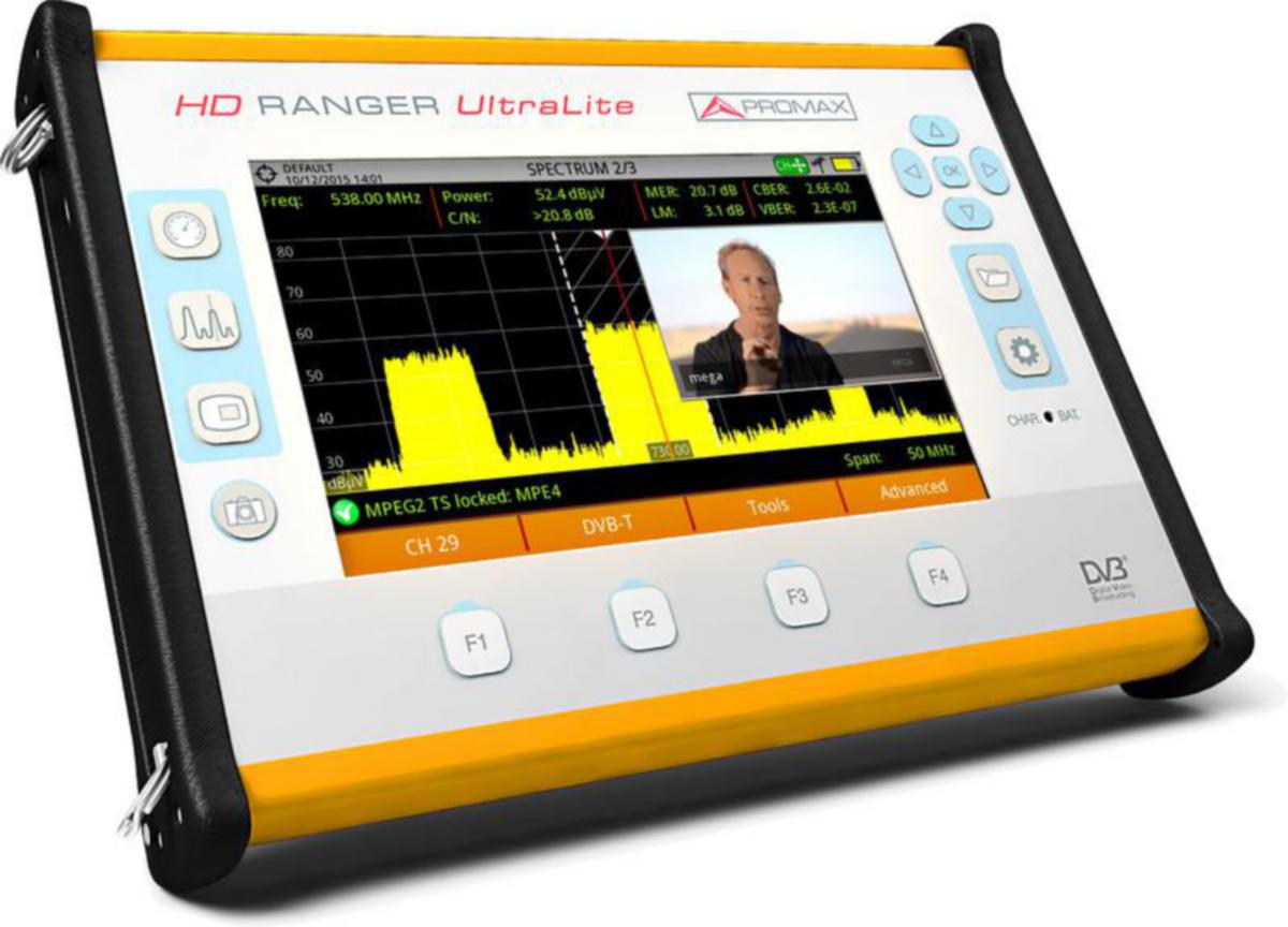 Lataa mittausraportit tietokoneeseen ja asenna uusia ominaisuuksia veloituksetta.Käteen sopiva muotoilu ja pieni koko, paino vain 1,4 kg. Todella kevyt ja kätevä käyttää.HDRANGER -sarjan suorituskyky ja nopeus.DIGITAL STANDARDS - DVB-T, DVB-T2- DVB-C, DVB-C2, QAM Annex C- DVB-S, DVB-S2, DSS- Dolby Digital PlusCONNECTIVITY - Universal RF input- Audio/Video input- USB interfaceWEIGHT 1.4 kgFUNCTIONS - Constellation diagram for all DVB standards- StealthID (instant signal identification)- DVB-S2 multistream- PLS (physical layer scrambling)- Ultra fast spectrum analyser (90 ms sweep time) with peak hold - Field strength- Task planner- H.265 detectionPC CONNECTION (via USB interface) - NetUpdate 4 free software- Free and automatic firmware updates- Datalogger data download- Channel tables customization- Measurement reports