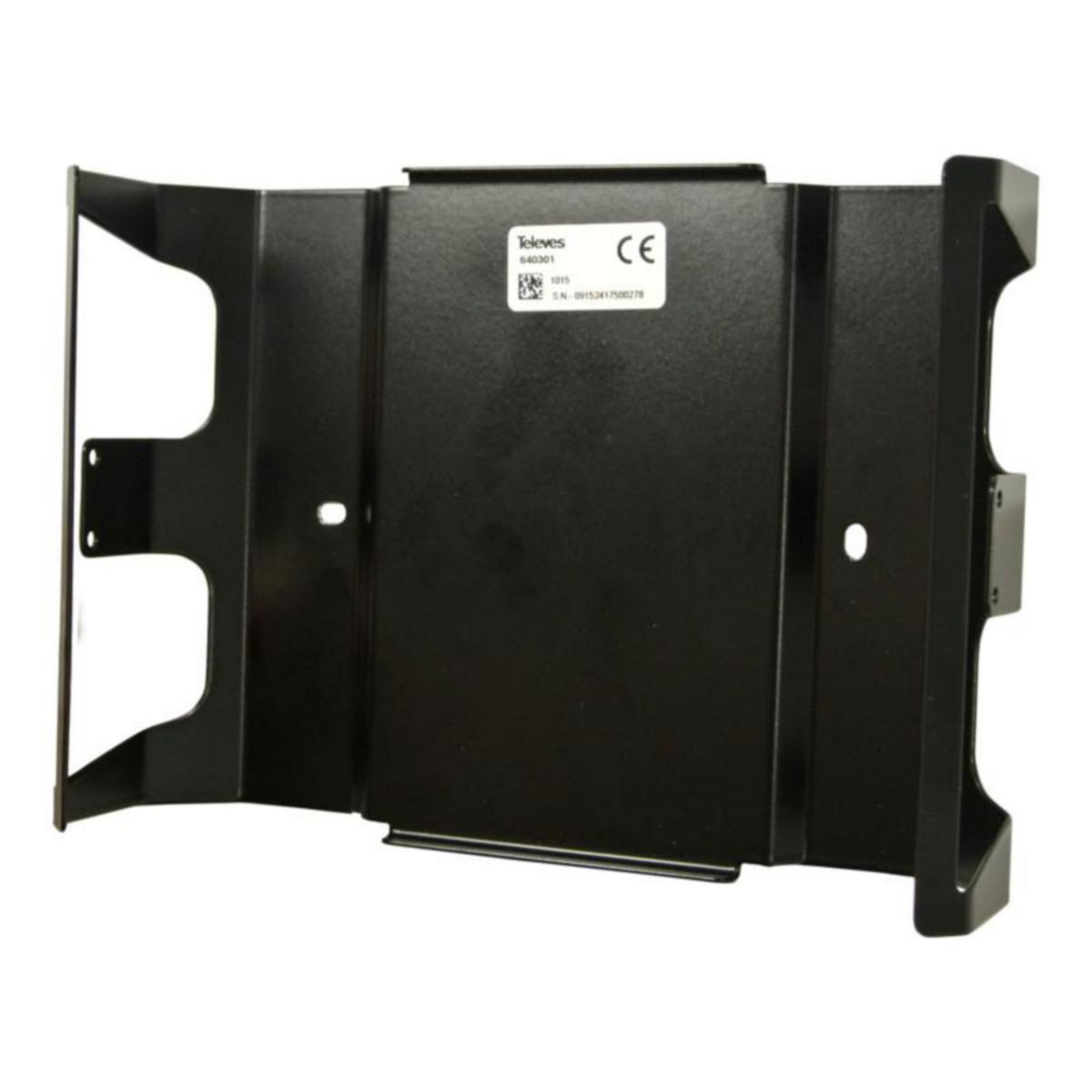 Musta, teräksinen kiinnike CoaxData-reitittimen (T769301) ja modulaattorin (T585401) seinäkiinnitykseen.