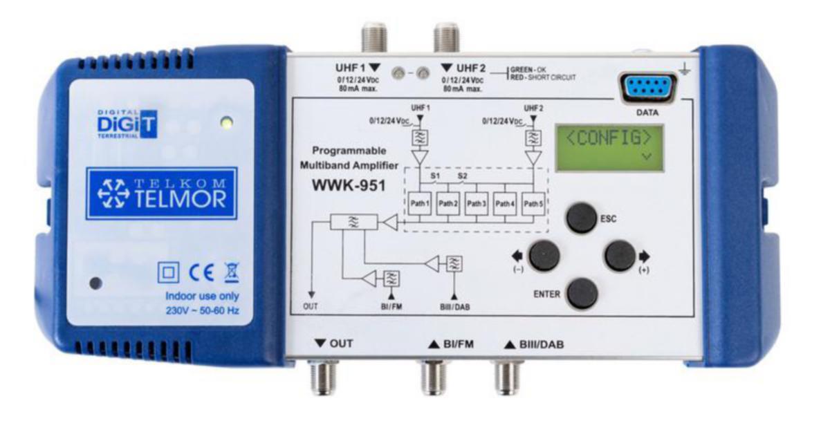 Digitaalisesti ohjelmoitava vahvistin WWK-951LTE on suunniteltu digitaalisille (DVB-T/T2) TV -kanaville sekä DAB ja FM radiolähetyksille. Käyttökohteina esimerkiksi rivitalot, pienet kerrostalot, toimistorakennukset ja koulut.Edullinen ja helppokäyttöinen. Käyttöönotto onnistuu näppärästi etupaneelin painikkeilla, eikä erillistä ohjelmointilaitetta tarvita lainkaan. • Viisi ohjelmoitavaa UHF -suodinta, • UHF1, UHF2, VHF ja FM -tulot• Kaistanleveys säädettävissä 8-48 MHz (1 … 6 TV-kanavaa),• UHF 1 ja UHF 2 tuloissa virransyöttö esivahvistimelle• Vahvistin on yhteensopiva myös DVB-T2 -signaalia kanssa• Alhainen virrankulutus• Yksinkertainen asennus ja konfigurointi• LTE700 ja LTE800 ready