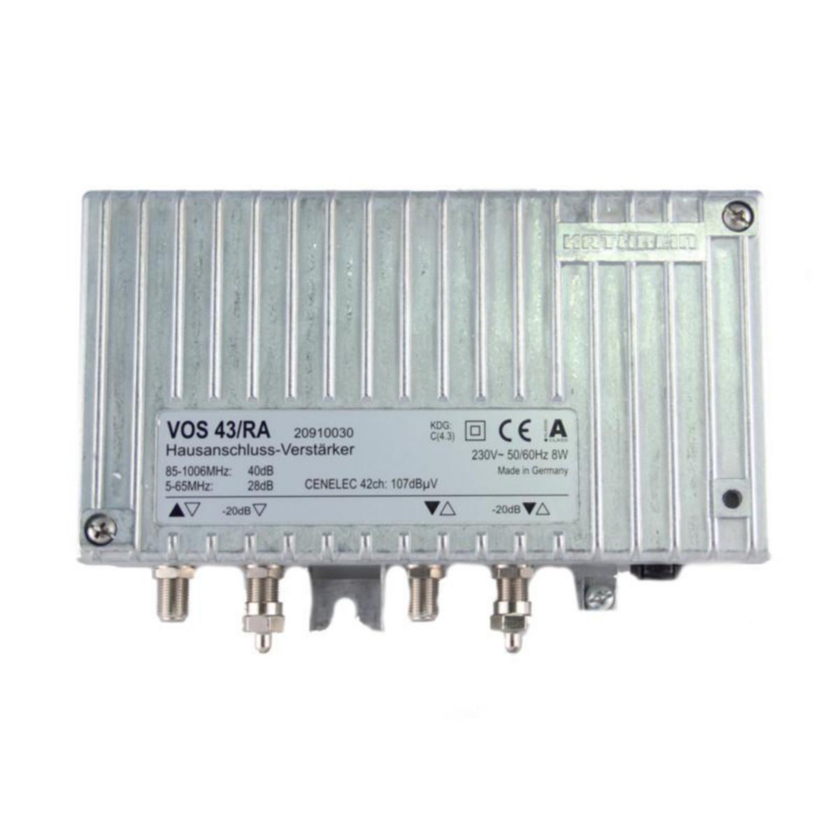 Talovahvistin. Myötäsuunta 85-1006MHz, vahvistus 34/40 dB, CTB:107 dB, säädettävä tulovaimennus ja tilt, 3 dB kiinteä slope, paluusuunta 5-65 MHz, aktiivinen 28dB, passiivinen -1 dB tai OFF, F-liittimet, paikallisyötetty 230 VAC, 1-tulo.