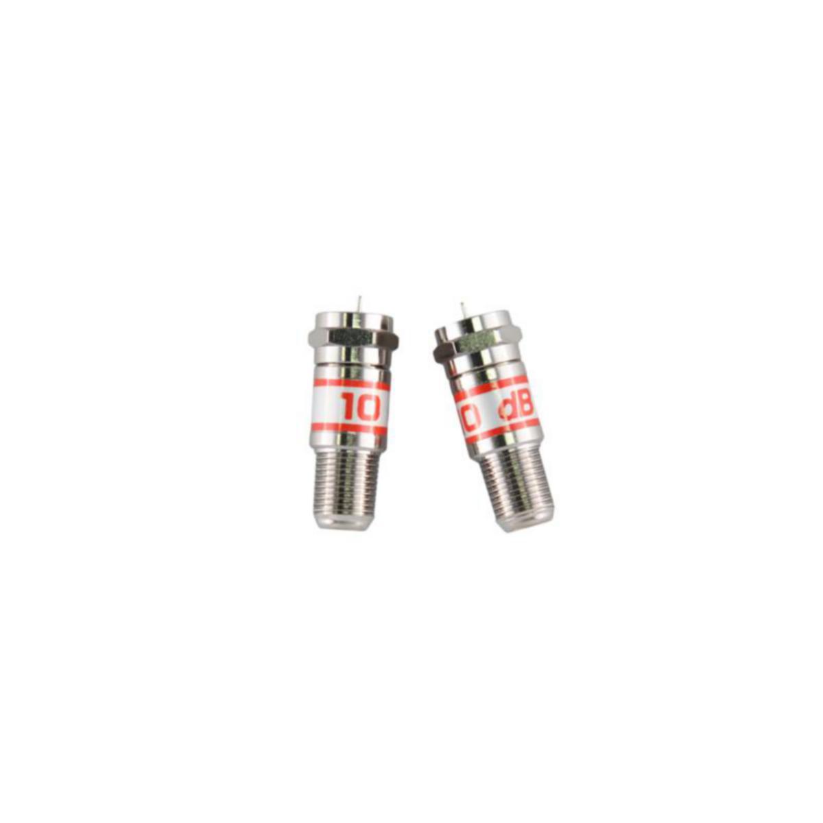 Kiinteä vaimennin 10dB, 0.3-3000MHz, suora putkimallinen, F-koiras/F-naaras liittimet. Ei DC jännitteen läpimenoa.