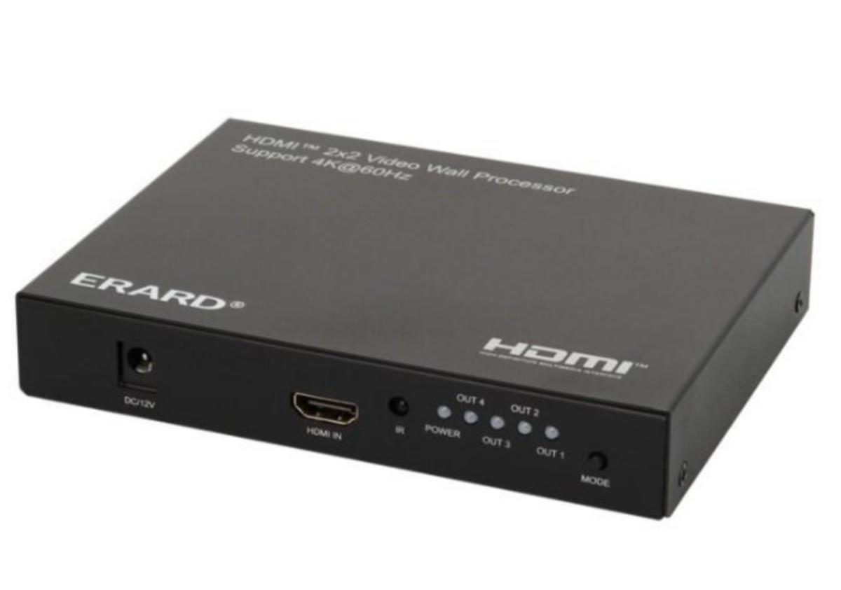 ERARD 727958 videoseinäprosessori vie yhden HDMI-tulon 2-4 näyttöön ja muodostaa yhtenäisen videoseinäkuvan. Skaalaimen avulla voit käyttää mitä tahansa näyttöjä muodostaaksesi yhtenäisen kuvan eli videoseinän. Skaalaimesta valitaan kuvan mukaan kuinka näytöt ovat asetettu.Skaalaimen asettelu mahdollisuudet ovat:2x2 - Kaksi vierekkäin ja kaksi päällekkäin