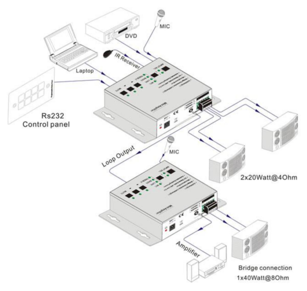 KanexPro AP2DBL on (D-luokan) minivahvistin, jossa on ekvalisaattori ja mikrofonimikseri. Laitteen antama teho on 2x20W@4Ohm tai sillattuna 1x40W@8Ohm. AP2DBL on kompakti vahvistinmikseri, joka on pienen kokonsa ansiosta mahdollista sijoittaa lähes mihin tahansa. Laitetta on mahdollista ohjata RS-232- komennoilla. Mikseri sisältää erilliset volyymin ja balanssin säädöt ja se tukee balansoitua / balansoimatonta signaalia. Ominaisuudet: Nopeat vaihdot tulojen välillä