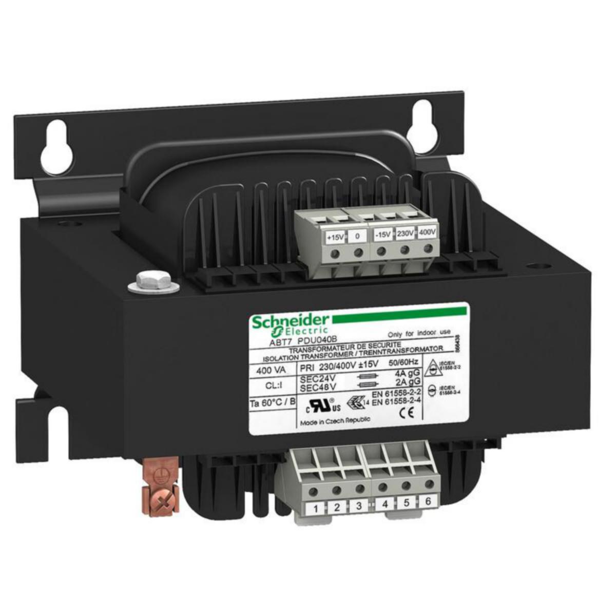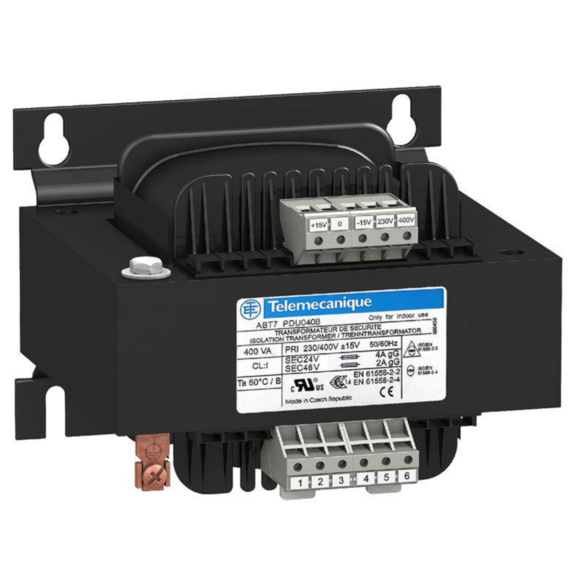 Phaseo ABT7, ABL6Yksivaiheiset muuntajat 230 V ... 400 V - 25 VA ... 2500 VAPhaseo on entistäkin kompaktimpi ja yksinkertaisempi - kolmella muuntajamallilla se täyttää kaikki käyttötarpeet.Uusi yuniversaali kaksoiskäämitys: innovatiivinen ja tehokas automaatiotuote. Optimaalinen yhden käämin malli: testattujen tuotteiden sukupolvi. Taloudellisuutta ja riittävät ominaisuudet sarjavalmistuksen automaatiojärjestelmiin.Kiinnitys Din-kiskoon (mallista riippuen) tai paneeliin (ruuvi)Toisiomaadoitus plug-in-siltajohdoilla (mallista riippuen)SignalointilediKäyttölämpötila: +60 °CToisiokäämien sarja-/rinnakkaiskytkentä plug-in-silloituksilla (mallista riippuen)Optimisarja 25 VA ... 2500 VA - yksi käämitysKiinnitys paneeliin (ruuvi) tai Din-kiskoon (mallista riippuen)Käyttölämpötila: +50 °CKustannustehokas sarja 40 VA ... 400 VA - yksi käämitysKiinnitys paneeliin (ruuvi)Käyttölämpötila: +40 °CSovellukset:Teollisuus ja rakentaminen: yksinkertaiset koneet, kuljettimet, prosessit, ajoneuvoteollisuus...Solenoidiventtiilit, kontaktorit...