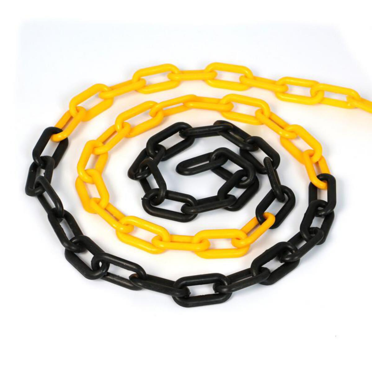 Muoviketju tilanrajaukseen.Kestävä musta-keltainen muoviketju tilojen rajaamiseen. Ketju on erittäin kovaan kulutukseen sopivaa, eikä murru tai rikkoonnu helposti. Sopii siksi myös ulkokäyttöön ja vaativampiin olosuhteisiin.Väri vaihtuu noin 57 cm välein. Lenkin paksuus 8mm, ketjun pituus 25m. Materiaali: PVC