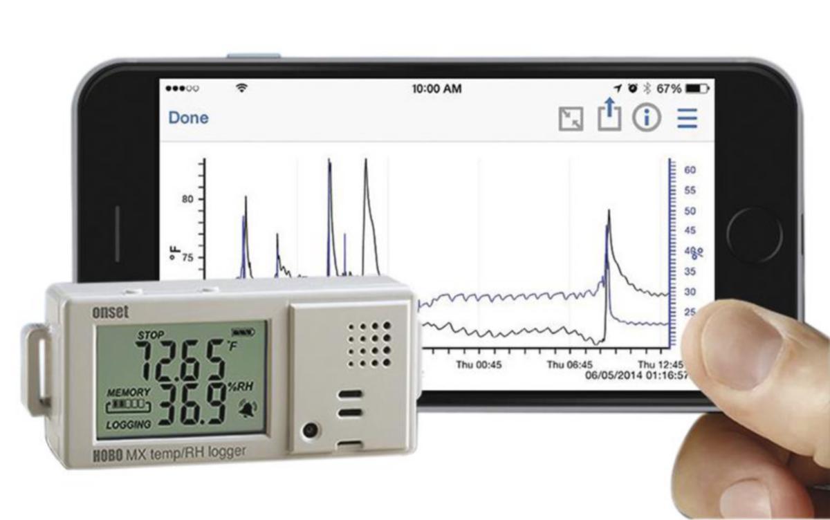 Dataloggeri sisätilojen lämpötilan ja ilman suhteellisen kosteuden mittaamiseen. Tiedonsiirto tapahtuu Bluetooth Smart- yhteyden kautta, iOS- tai Android-käyttöjärjestelmää tukeviin laitteisiin ilmaisen HOBOmobile app -ohjelmiston avulla. Tallennettujen tietojen luenta voidaan tehdä jopa 30 m etäisyydeltä. Laitteen sisäiseen muistiin mahtuu 84650 mittaustapahtumaa ja tallennusaikaväli on valittavissa 1 s – 18 h välillä. Lämpötilan mittausalue on -20 °C ... +70 °C ja kosteusalue 1 % - 90 % välillä.