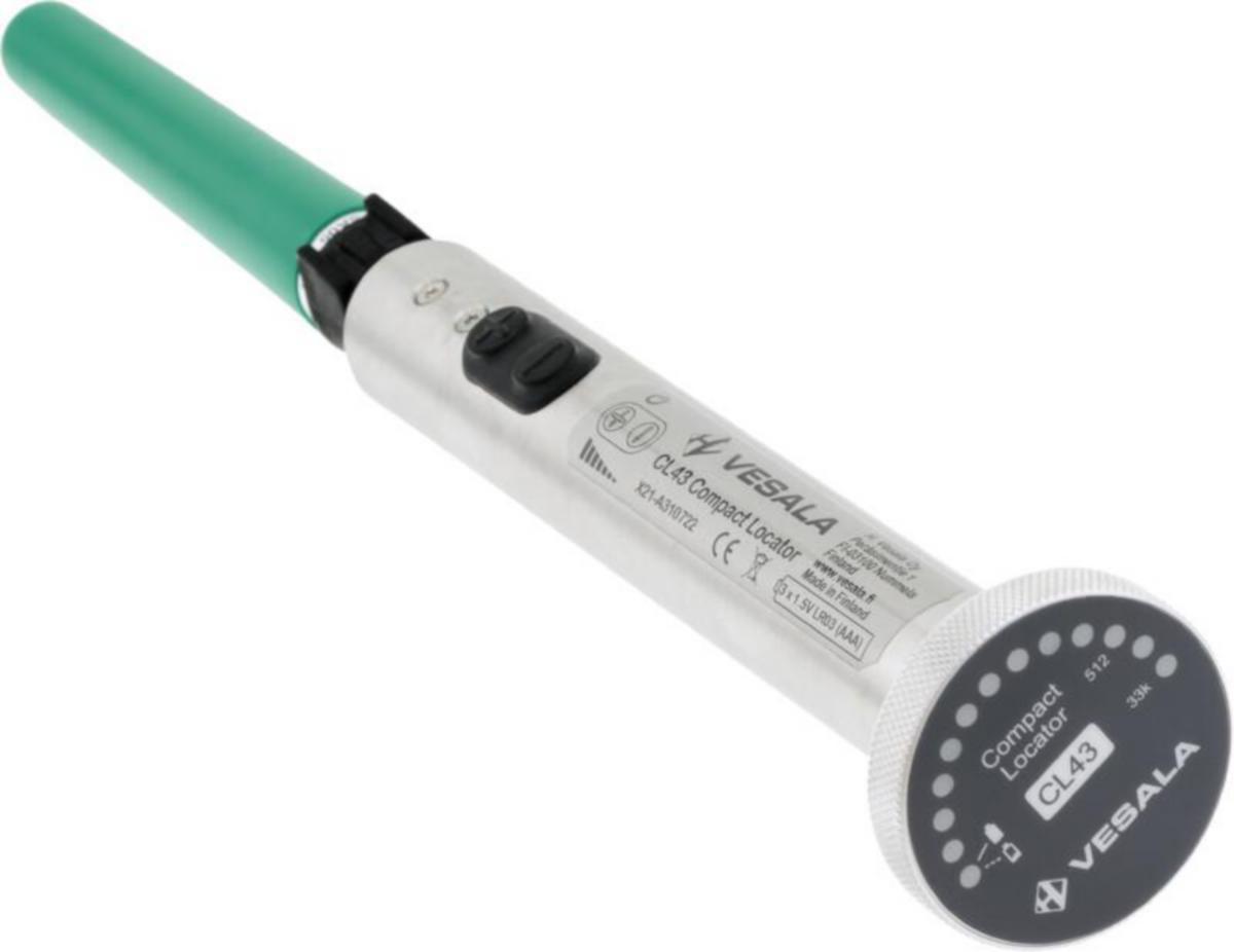 CL43-PB PienoishakulaiteCL43 on edullinen ja helppokäyttöinen johtimien, kaapeleiden sekä lähetinsondien hakulaite. CL43:lla voi seurata ja paikantaa maakaapeleita ja putkilähetinsondeja useiden metrien syvyydestä. Sisätiloissa sen avulla voidaan etsiä esim. lattialämmityskaapeleita ja johtimia seinien sisältä.CL43-vastaanottimen käyttöliittymässä on vain kaksi painiketta ja 13 led-merkkivaloa. Äänimerkkejä varten on sisäänrakennettu kaiutin. Antennien vaihtaminen ja irrottaminen on helppoa, minkä ansiosta laite sopii vaikka taskuun.CL43-vastaanotin tukee 33kHz:n taajuutta, joka on yhteensopiva Vesalan lähettimien ja sondien (putkilähettimien) sekä monien muiden valmistajien hakulaitteiden kanssa. Vesalan oma CL43:n kanssa yhteensopiva 33kHz lähetin on SG33 (Snro 6709174). Täydellinen hakulaitteisto, jossa on sekä SG33-lähetin että CL43-vastaanotin, on tyypiltään CT33 (Snro 6709164).Tuotekoodin CL43-PB varustus on tarkoitettu erityisesti metalliputkien ja niiden tukosten etsimiseen 512Hz taajuudella. Varustus sisältää CL43-vastaanottimen paristoineen, 512Hz:lle yhteensopivan SA05-sauva-antennin (vihreä) sekä kantolaukun ja käyttöohjeen. Perusvarustuksen lisäksi tarvittava Vesalan lähetinsondi on PL18-05 (Snro 6709155) tai PL42-05 (Snro 6709165). Myös muiden valmistajien 512Hz sondeja voidaan käyttää.33kHz:llä toimivan kokoonpanon tuotekoodi on CL43-PA ja sen Snro on 6709156.CL43-laitteistoa voi koska tahansa täydentää monilla lisävarusteilla, kuten 6mm, 9mm tai 18mm putkilähetinsondeilla tai lähityöskentelyyn sopivalla LA43-antennilla (ks. oheinen valokuva laukusta ja sen sisällöstä erilaisilla lisävarusteilla). Tiedot lisävarusteista löytyvät CL43:n tuote-esitteestä.CL43 on kehitetty ja valmistettu Suomessa.