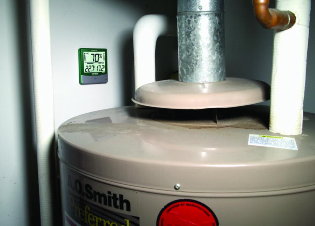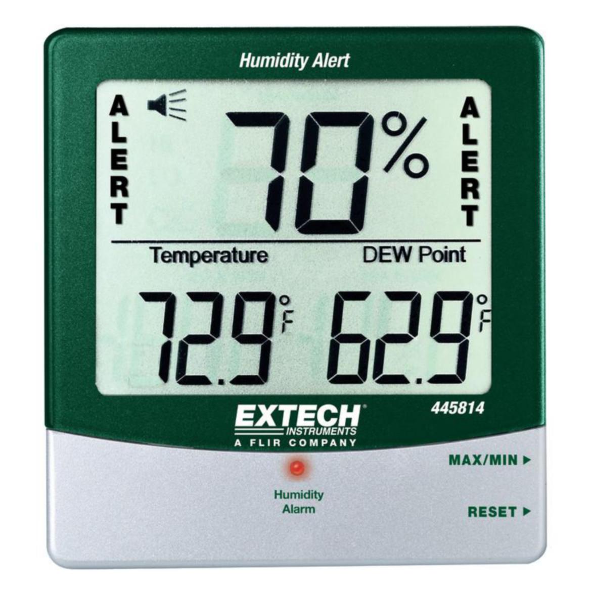 Extech 445814: Kosteus- ja lämpömittari ilmankosteushälytyksellä. 445814 kosteus- ja lämpömittari esittää sisälämpötilan, ilmankosteuden ja kastepisteen. Ilmankosteushälytys joka hälyttää kun ilmankosteus ylittää käyttäjän asettaman raja-arvon. Suuri LCD näyttö. Ominaisuudet:Suuri LCD näyttöNäyttää samanaikaisesti lämpötilan, ilmankosteuden ja kastepisteenIlmankosteushälytin hälyttää äänimerkillä sekä varoitusvalolla, kun käyttäjän asettama kosteusraja ylittyyMinimi- ja maksimiarvojen tallennusIlmankosteuden mittausalue: 10-99% RHLämpötilan mittausalue: -10-60°CSeisontatukiSisältää seinäkiinnitystelineen ja AAA pariston