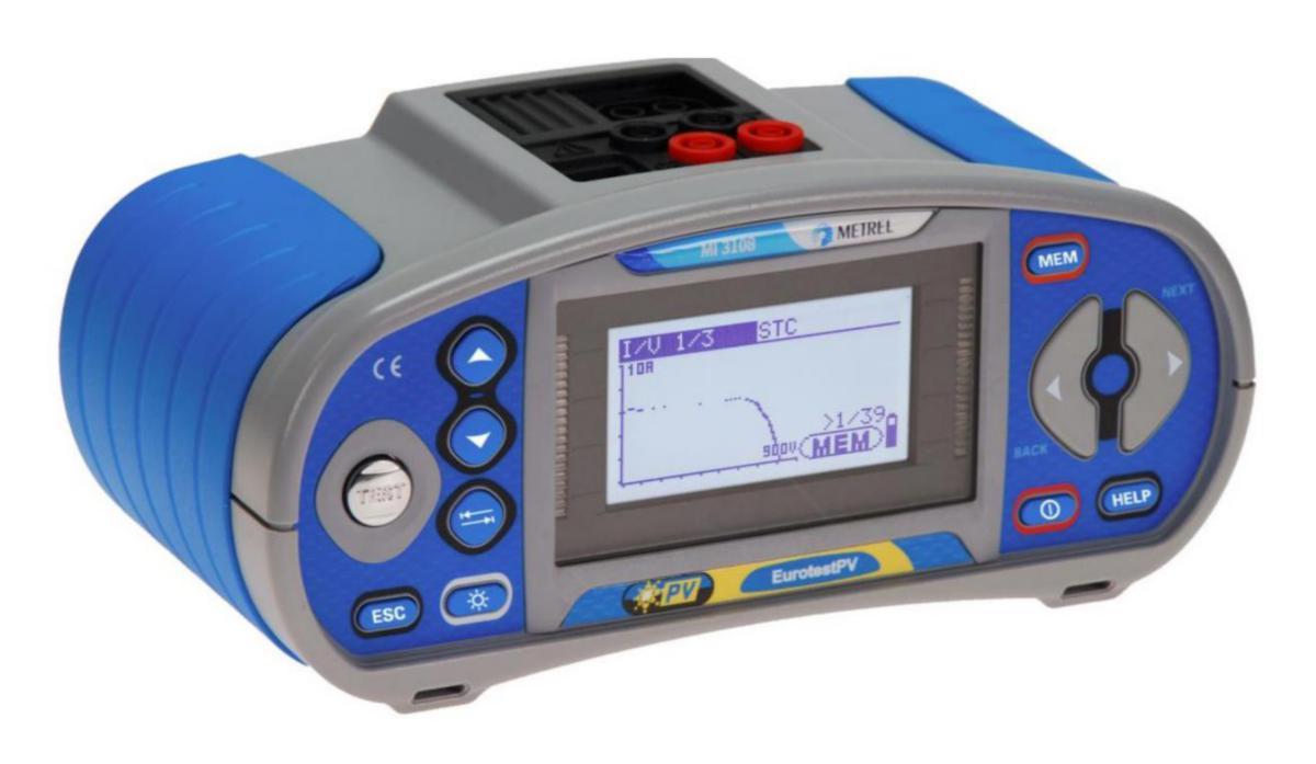 MI-3108 Eurotest PV on suunniteltu sekä aurinkopaneelien DC-puolen testauksiin, että AC-puolen sähköturvallisuusmittauksiin. Testeri soveltuu niin käyttöönottomittauksiin, kuin myös aurinkopaneelien kunnonvalvontaan. Testerillä pystyt tarkastelemaan myös kohteen DC- sekä AC-puolen välistä hyötysuhdetta.Tarvitset lisävarusteeksi virtapihdin A1391 Mittarilla testaat DC-puolen vaadittavien PE-johtimen jatkuvuuden sekä asennuksen eristysvastusmittauksen lisäksi, myös paneelien I–U -ominaiskäyrän sekä laskennalliset STC (Standard Test Conditions) arvot. Tuetut mittaukset: DC - avoimen piirin jännite Uoc ja oikosulkuvirta Isc - I–U -ominaiskäyrä - jännite, virta ja teho - säteilyn voimakkuus kW/m2 - paneelin lämpötila - invertterin hyötysuhde AC - eristysvastusmittaus 50 V, 100 V, 250 V, 500 V ja 1 kV - PE-johtimen jatkuvuusmittaus 200 mA ja 7 mA - linja- ja silmukkaimpedanssi sekä oikosulkuvirta - oikosulkuvirta ilman vikavirtasuojan laukaisua - vikavirtasuojan testaus tyypit AC, A ja B - maavastusmittaus - TRMS-jännite, vaihejärjestys ja taajuus - tehot sekä harmoniset yliaallot - AC-virta Vakiovarusteet: Kuljetuslaukku, testijohto 3 X 1,5m, mittapäät, hauenleuat, PV MC3/4 uros/naaras liittimet, auringonsäteilyanturi A1427, 2 kpl kiinnityspihtejä, Schuko-mittapää, Safety probe A1384, lämpötila-anturi, laturi, 6 NiMH AA paristot, USB ja RS232 kaapelit, PC-ohjelma Eurolink Pro ja kalibrointitodistus. MI 3108 PS (pro) sisältö - MI 3108 ST - EurotestPV etäyksikkö - mittapää käynnistyksellä - PC SW EuroLink PRO Plus -lisenssi