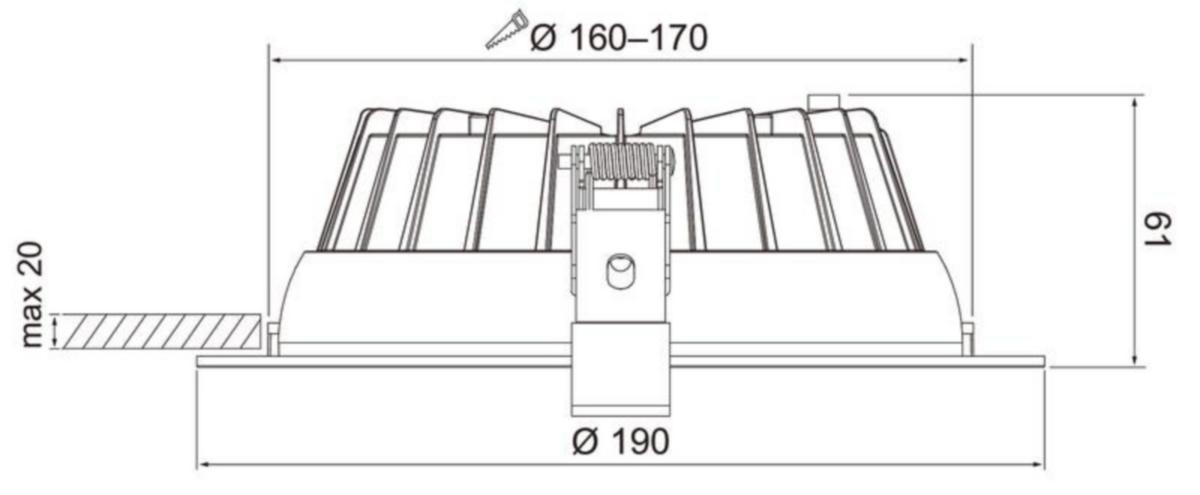 170 mm: 18 W 2700 lm, 20 W 3000 lm, 22 W 3300 lm, 24 W 3350 lm.