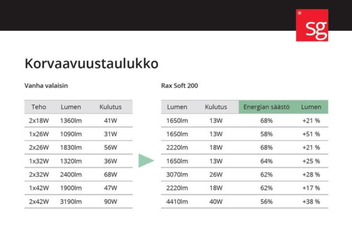 Rax Soft 200 on tehokas downlight-valaisin julkisten rakennusten, toimistojen, käytävien jne. valaistukseen, jossa optimoidun linssi- ja heijastinoptiikan yhdistelmä takaa erinomaisen valonsäädön. Saatavana mattapintaisella heijastimella, joka takaa parhaan mahdollisen tehokkuuden. Rax Soft 200 on helppo asentaa jousilla, jotka sopivat kattopaneeleihin, joiden paksuus on 1-50 mm. Tehoa voidaan säätää DIP-kytkimistä.