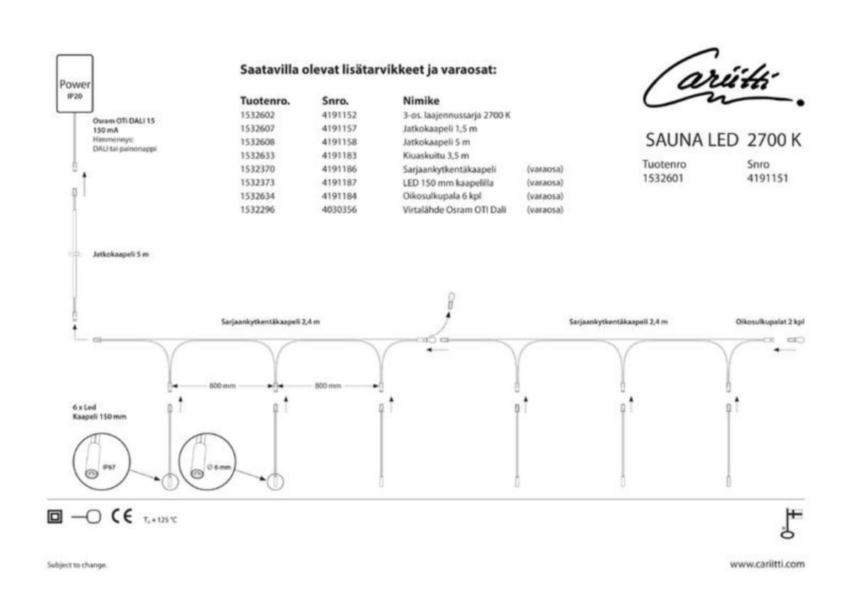 Saunaan ja lauteisiin helposti asennettava LED-sarja. Sarjassa olevat ledit tarvitsevat esim. laudeasennuksessa ainoastaan 6 mm:n reiän, jolloin asennus onnistuu paljon huomaamattomammin, kuin mitä aiemmin on totuttu. Selkeät asennusohjeet takaavat, että asennuksessa ei voi epäonnistua; liittimet on valittu niin ettei niitä voi kytkeä väärin. Virtalähteenä laadukas Osram OTi DALI 15, jolloin sarjaa voi himmentää joko painonapilla tai dali-säätimellä. Sarjaa voi laajentaa erillisellä 3-os. laajennusosalla aina 15 lediin saakka. Värilämpötila saunaan sopiva 2700 K LED IP67. Sarjaan on saatavilla useita lisätarvikkeita, kuten CR-03-asennuskalusteet (kulta, kromi ja musta), kiuaskuitu linssillä, lämpö- ja kosteusmittarit ja paljon muuta. Huom!Jos saunan lämpötila on yli +80ºC tai saunassa käytetään puulämmitteistä kiuasta, suosittelemme käyttämään Cariitti-valokuitusarjaa.
