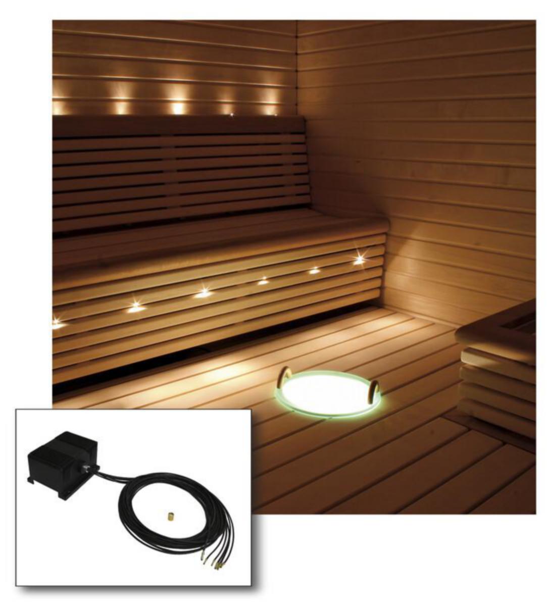 Sarja sisältää saunaan lauteen alle tai saunan ulkopuolelle sijoitettavan projektorin (IP55), 8-kuituisen lasikuitunipun sekä kiuaslinssin.Sarjan kuidut ovat lasia ja kestävät 180°C kuumuutta. Sarjan kuidut sopivat asennettavaksi sekä lauteisiin että kattoon. Projektorin asennuskorkeus saunassa max. 70 cm lattiasta. Huom! Kuitua ei saa katkaista!- LED 2,1 W - 220-240 VAC/700 mA DC - 50 000 h - 3000 K - Ra >90 - 136 lm - Projektorin mitat 100 x 150 x 80 mm - Kuidut: 1.5 mm (B1,5): 2 x 2,5 m, 2 x 3,0 m, 2 x 3,5 m ja 2 x 4,0 m- Ei himmennettävä
