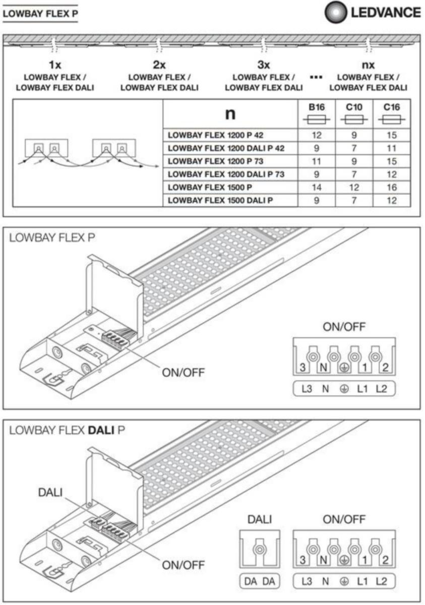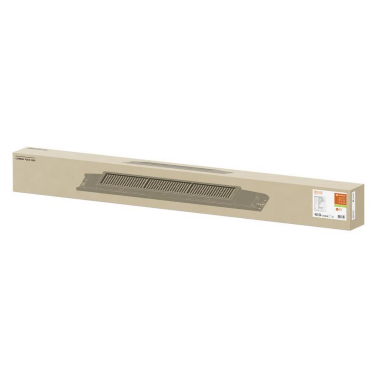 LEDVANCE LOW BAY FLEX avoimet teollisuusvalaisimet tekevät vaikutuksen helpolla asennettavuudella, jopa 160 lm/W:n valotehokkuudella ja jopa 100 000 tunnin käyttöiällään. Jopa 16 800 lm:n valovirralla ja kolmella avauskulmavaihtoehdolla, ne soveltuvat erinomaisesti erilaisten teollisten tilojen tai myymälöiden valaisemiseen. Pallonkestävät Ball Proof-mallit soveltuvat erinomaisesti myös sisäurheilutilojen valaistukseen. Low Bay -valaisimia on saatavana 1200 ja 1500 mm:n pituisina ja niiden valovirrat ovat 6510-, 11315- ja 16800 lm. Valaisimen värilämpötila on neutraali 4000 K. ON/OFF-mallit ovat 5-napaisesti läpijohdotettu (5x2,5mm) ja DALI-mallit ovat jopa 7-napaisesti läpijohdotettu (7x2,5mm). Valaisimen päädyt saa helposti auki ilman työkaluja ja vedonpoisto on nopea ja helppo toteuttaa nippusiteellä kiinteään kiinnityspisteeseen (nippuside ei sis. pakkaukseen). Valaisimista on saatavana erikseen DALI- ja pallonkestävät Ball Proof -mallit. LEDVANCE Low Bay -valaisimet soveltuvat käytettäväksi sisätiloissa -25 °C ... +50 °C lämpötilassa, ne ovat IP23- ja IK08-luokiteltuja ja niille on myös myönnetty ENEC-sertifikaatti. Valaisimien keskimääräinen käyttöikä on 100 000 tuntia (L80/B10 @ +25 °C) ja koko tuoteperheelle myönnetään viiden vuoden tuotetakuu.