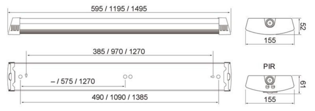 600 mm: 11 W / 1430 lm, 20 W / 2600 lm.