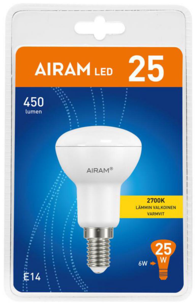 Airam led 2700KErittäin kattava lamppusarja, josta löytyy vaihtoehto kaikkiin kodin valaistustarpeisiin. Kevyet ja kestävät lamput korvaavat täysin hehku- ja halogeenilamput sekä energiansäästölamput. Lamppujen värilämpötila on miellyttävä lämmin valkoinen (2700 K). Opaali valonlähde antaa häikäisemättömän valon. Ympäristöystävälliset pahvipakkaukset on värikoodattu. Väri kertoo hehkulamppuvastaavuuden ja helpottaa kuluttajan valintaa. Myös tekniset tiedot on esitetty selkeästi. Varmista sarjan 12 V lamppujen ja muuntajan yhteensopivuus.Lamppujen polttoikä 15 000 tuntia.