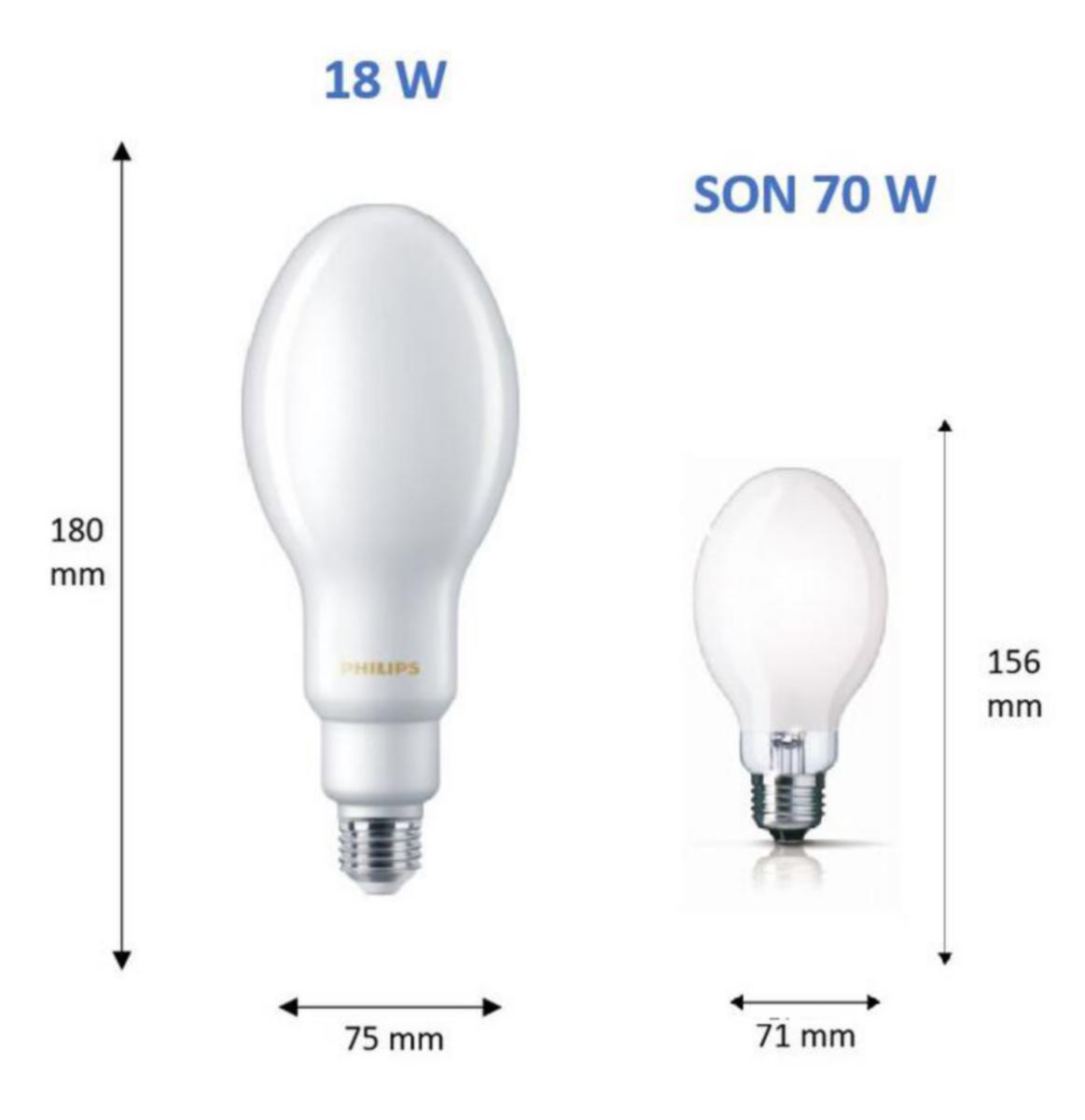 Tarkistathan asennusohjeet aina ennen asennusta. Philips Trueforce CorePro LED-lamput ovat helppo tapa korvata perinteiset elohopeahöyry- ja suurpainenatriumlamput. Lampun teho on 18 W (korvaa 80 W elohopeahöyrylampun ja 70 W suurpainenatriumlampun) ja sen valovirta on 3000 lm. Lampulla on nopea takaisinmaksuaika ja huomattava energiansäästö. Lamppu on IP65 ja soveltuu ulkovalaistuskohteisiin, kuten kaduille, teille ja puistoihin, mutta myös sisätiloihin, kuten teollisuuskohteisiin. Lampun käyttöikä on 25 000 tuntia kolmen vuoden tuotetakuulla.Huomioithan, että LED-korvaaja on kooltaan isompi kuin perinteinen lamppu. Signify (entinen Philips Lighting) on globaali valaistuksen markkinajohtaja. Valikoimaamme kuuluu mm. LED-lamppuja ja -valaisimia, langattomia ohjausjärjestelmiä sekä muita valaistusinnovaatioita ammattikohteisiin ja koteihin. Kestävän kehityksen arvot ovat Signifyn yritystoiminnan ytimessä.