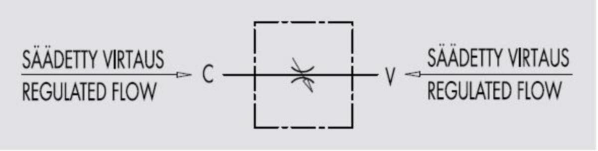 Venttiili säätää virtauksen molempiin suuntiin. Virtausaukkoa säädetään säätönupista, joka voidaan lukita. Huomioi, että virtausaukon kuristaminen voi lämmittää öljyä.