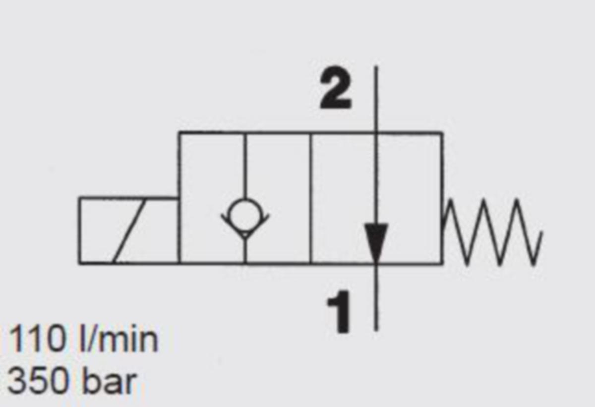 The solenoid-actuated 2/2 directional poppet valve WS12Y is a pilot operated cartridge valve. In de-energized mode it permits flow from port 2 to 1. When energized flow is blocked from port 2 to 1. In the opposite direction there is free flow possible. Cavity UNF 1 1/16-12. Qmax = 110 l/min Pmax = 350 bar