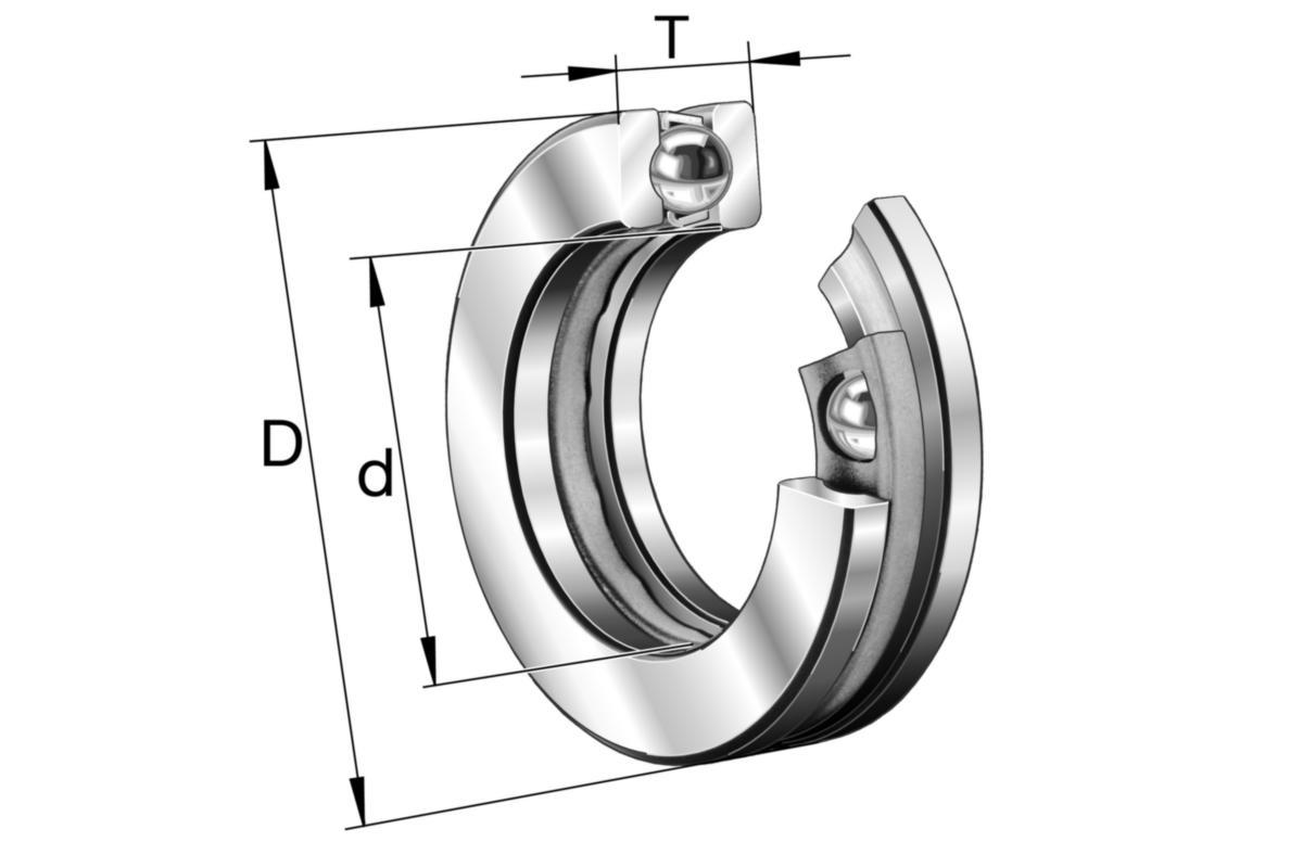 Yksisuuntainen aksiaaliurakuulalaakeri teräslevypitimellä tai messinkisellä kuuliin ohjautuvalla massiivii-ikkunapitimellä (MP). (Kuvan mittaviittaukset; d=sisähalkaisija, D=ulkohalkaisija, T=leveys)