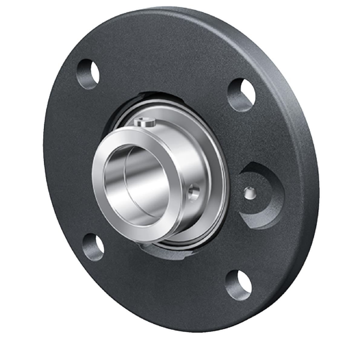 Valurautainen laakeriyksikkö (pyöreä). Kiinnitys neljällä pultilla. Kiinnitys akseliin epäkeskorenkaalla. P-tiivisteet.