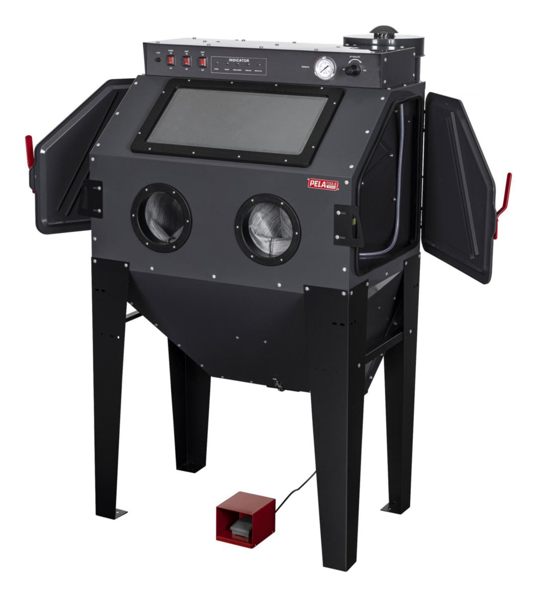 Hiekkapuhalluskaappi joka on varustettu kahdella hiekkapuhalluspistoolilla - käsi & kiinteä jalkaohjattu, 2 sivuovella, valaistuksella ja pölynimurilla. Pulverimaalattu rakenne. Erittäin hyvä hiekkapuhalluskaappi korjaamo- ja teollisuuskäyttöön.