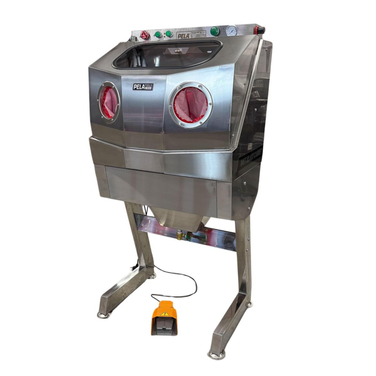 Wet blasting cabinet, 190 liters, made of stainless steel for gentle blasting of aluminum parts and other components where a smooth surface is desired. Water and blasting medium (glass) are mixed in an integrated sump and pumped up with a durable, maintenance-free pump. The mixture is directed through hoses to the nozzle, where compressed air is added to increase speed and create the cleaning effect. After the mixture hits the workpiece, it drains back into the sump and recirculates in the system. The wet blasting cabinet cleans through flow rather than friction, providing a gentle finish where water acts as a lubricant. This prevents the blasting medium from being embedded into the surface and helps the medium last longer.