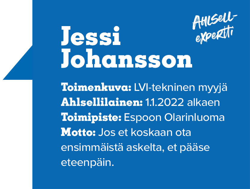 Espoon myymälässä Jessin aisaparina LVI-teknisenä myyjänä toimii Juha-Pekka Laitinen, jolta Jessi saa tarvittaessa lisää oppia. Tiimiin kuuluvat myös kaksi teollisuusmyyjää, kaksi sähkömyyjää, kuusi myymälähenkilöä sekä yksikön päälllikkö Tero Hynninen.