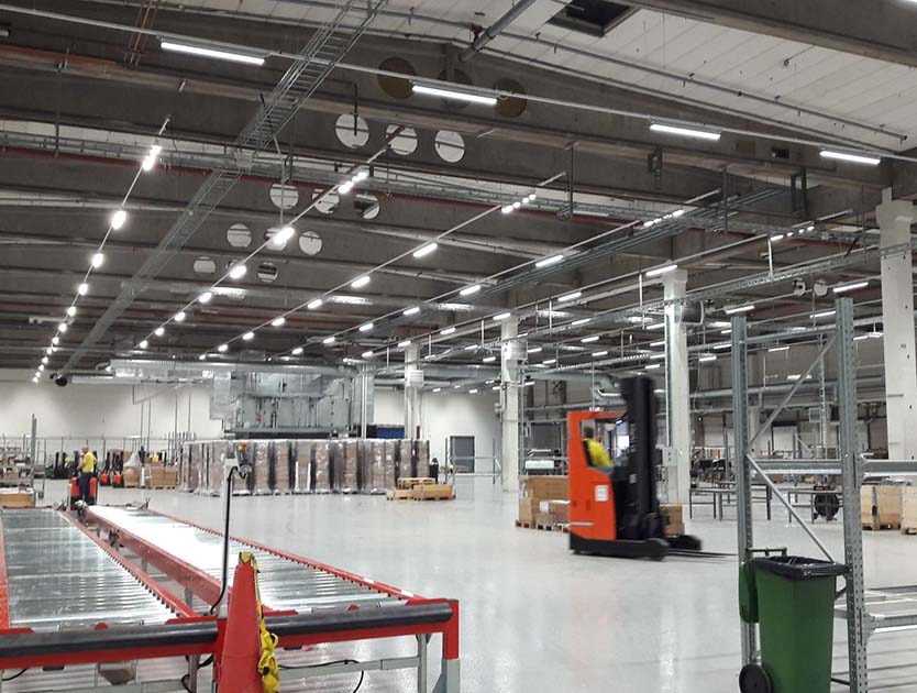 Esimerkki hallissa: 50 valaisinta, joissa 2x58W loisteputket